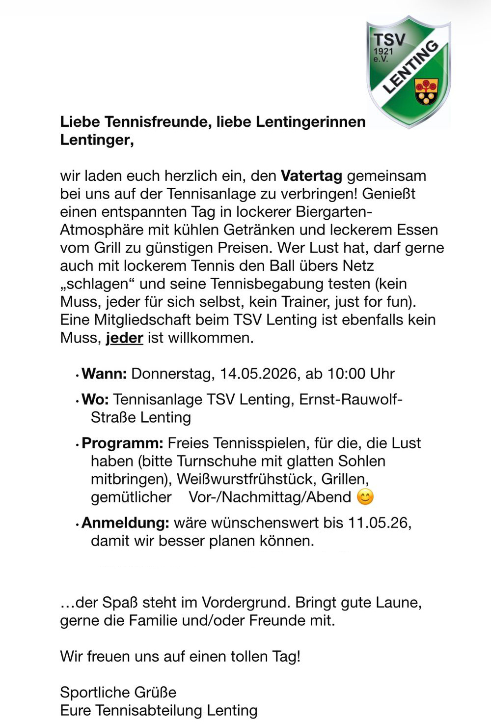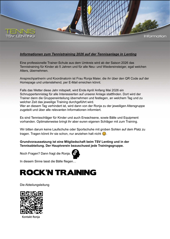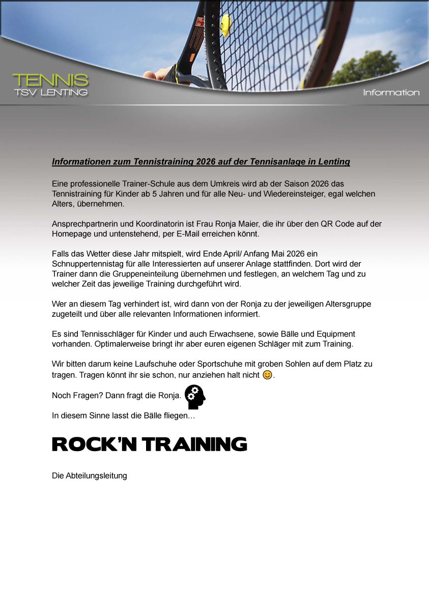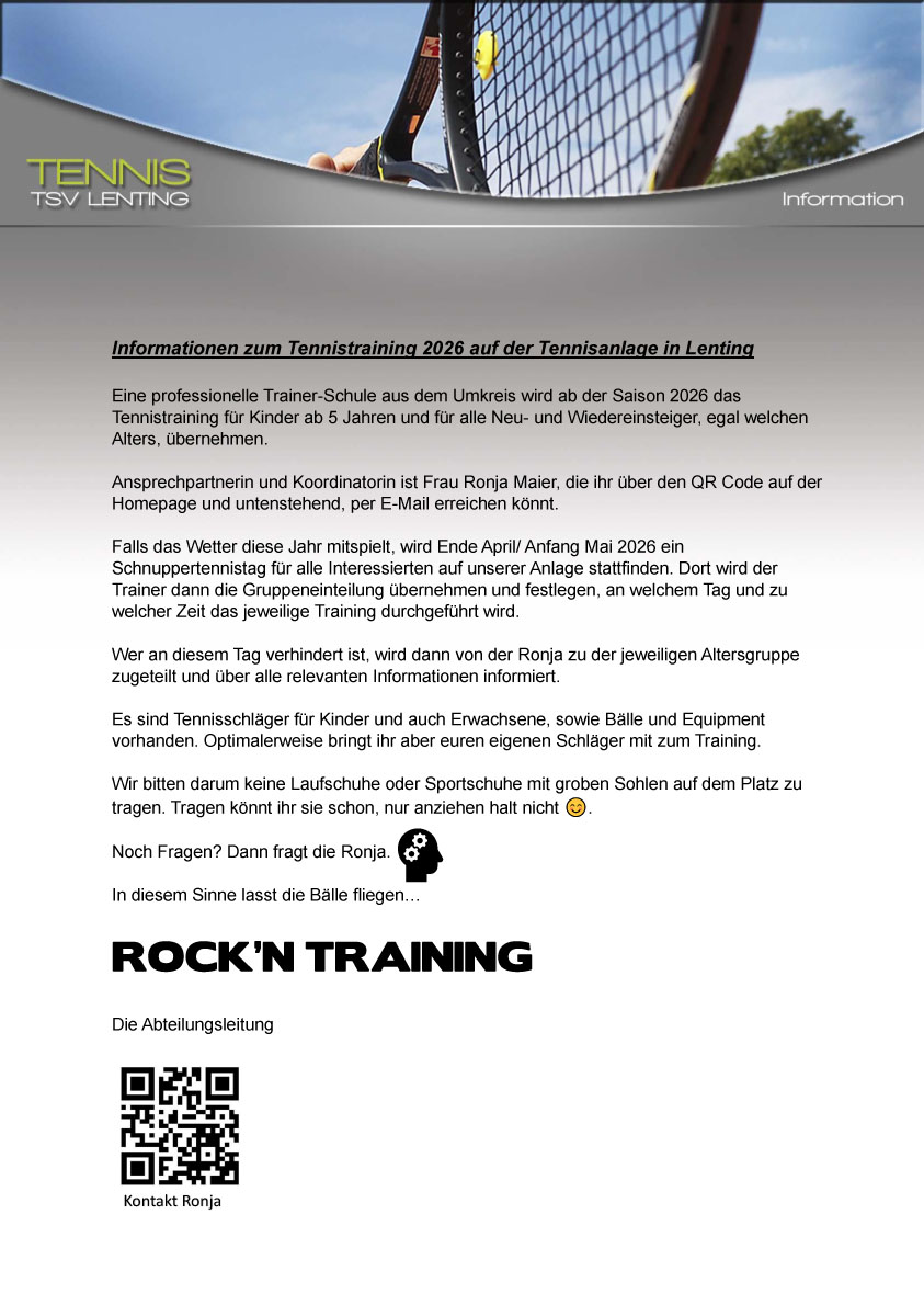 2026 wieder Kinder und Jugendtraining in Gruppen auf unserer Tennisanlage. Bitte unten anmelden. Bei Interesse für Einzeltraining bitte email an: jugendwart@tennis-lenting.de.